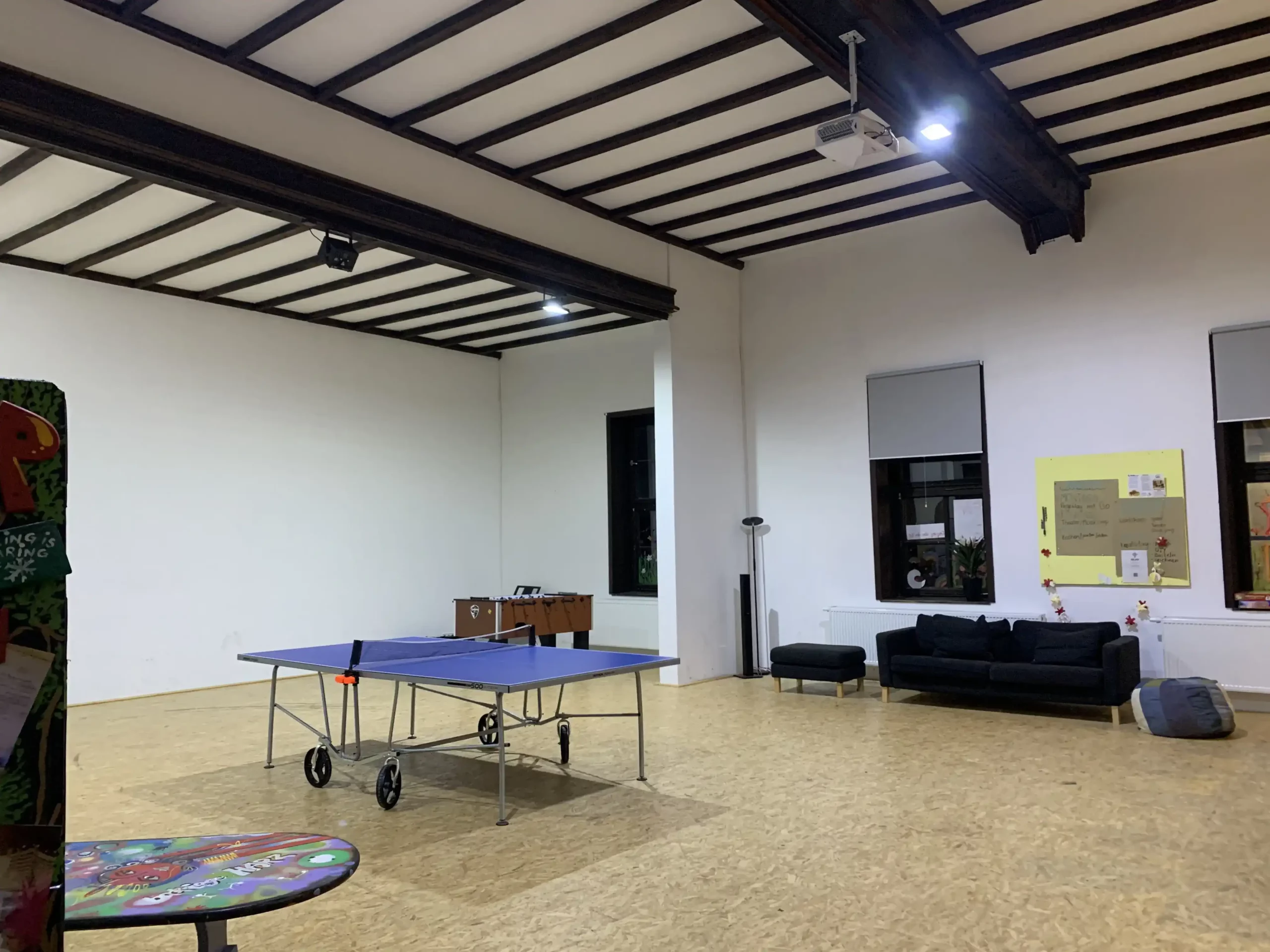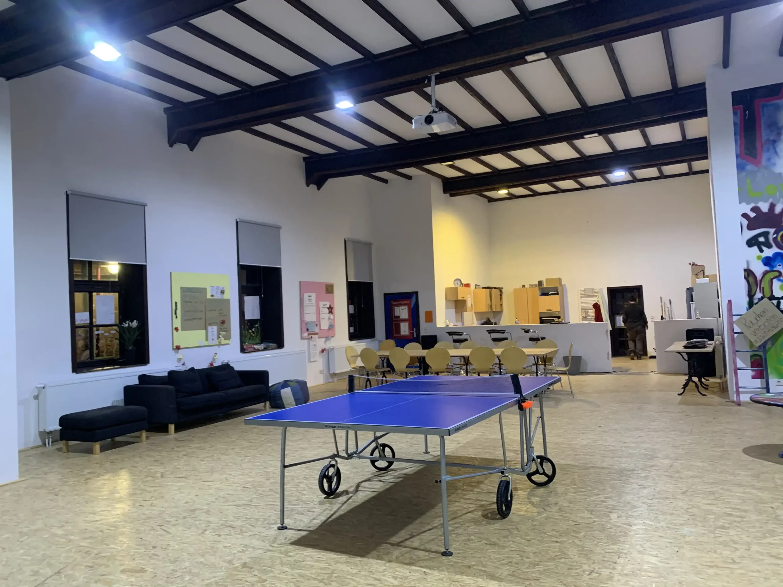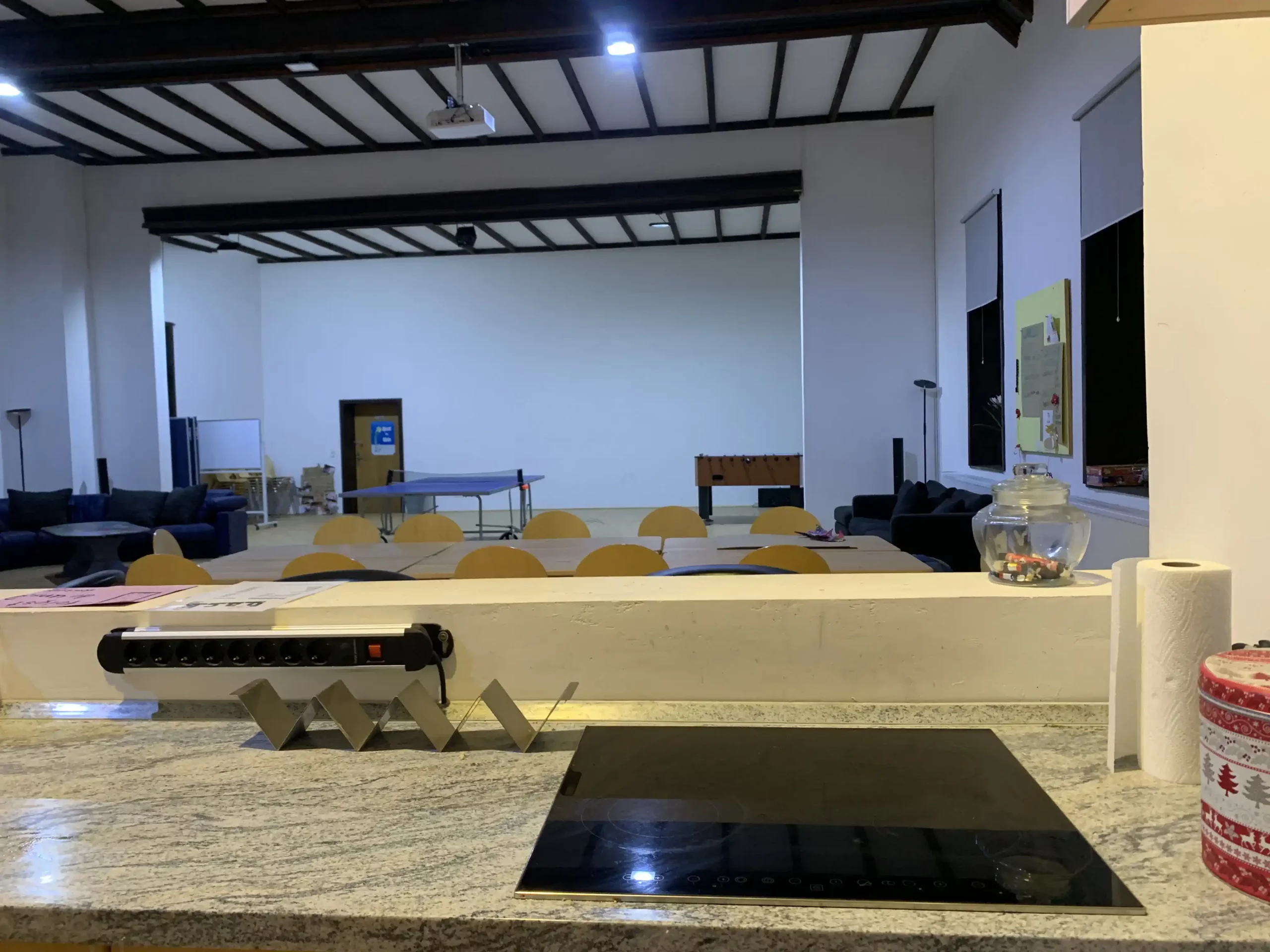 Es gibt rund 50 stapelbare Stühle, zwei Tischtennisplatten und einen Tischkicker. Eine gemauerte Barriere trennt den Küchenbereich mit E-Herd, Spüle, Spülmaschine, einem Getränkekühlschrank und einem Kaffeevollautomaten.