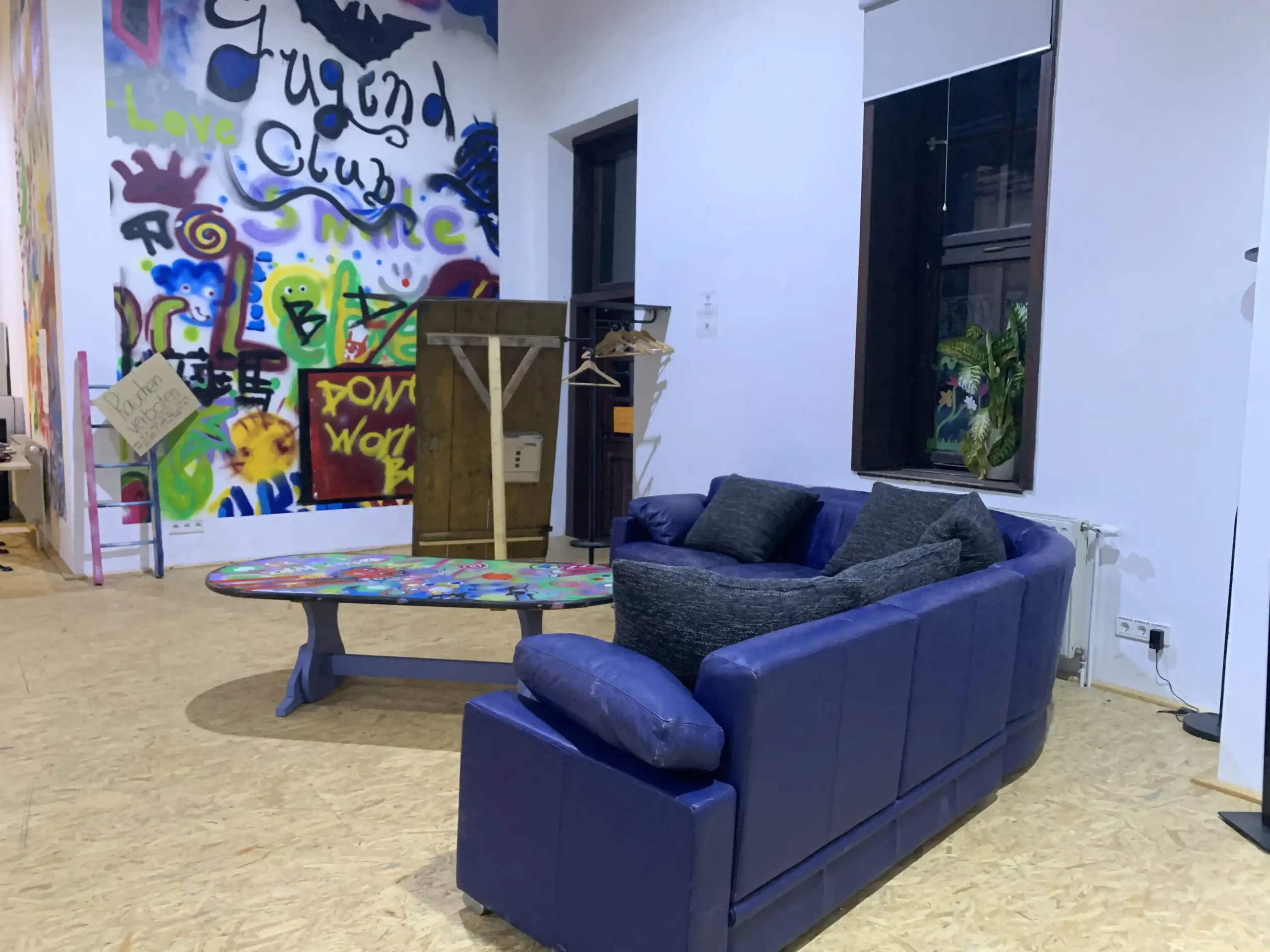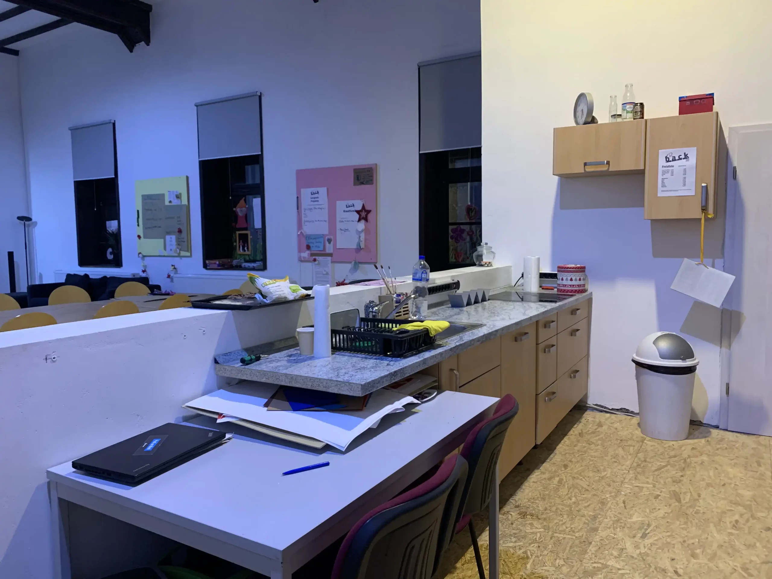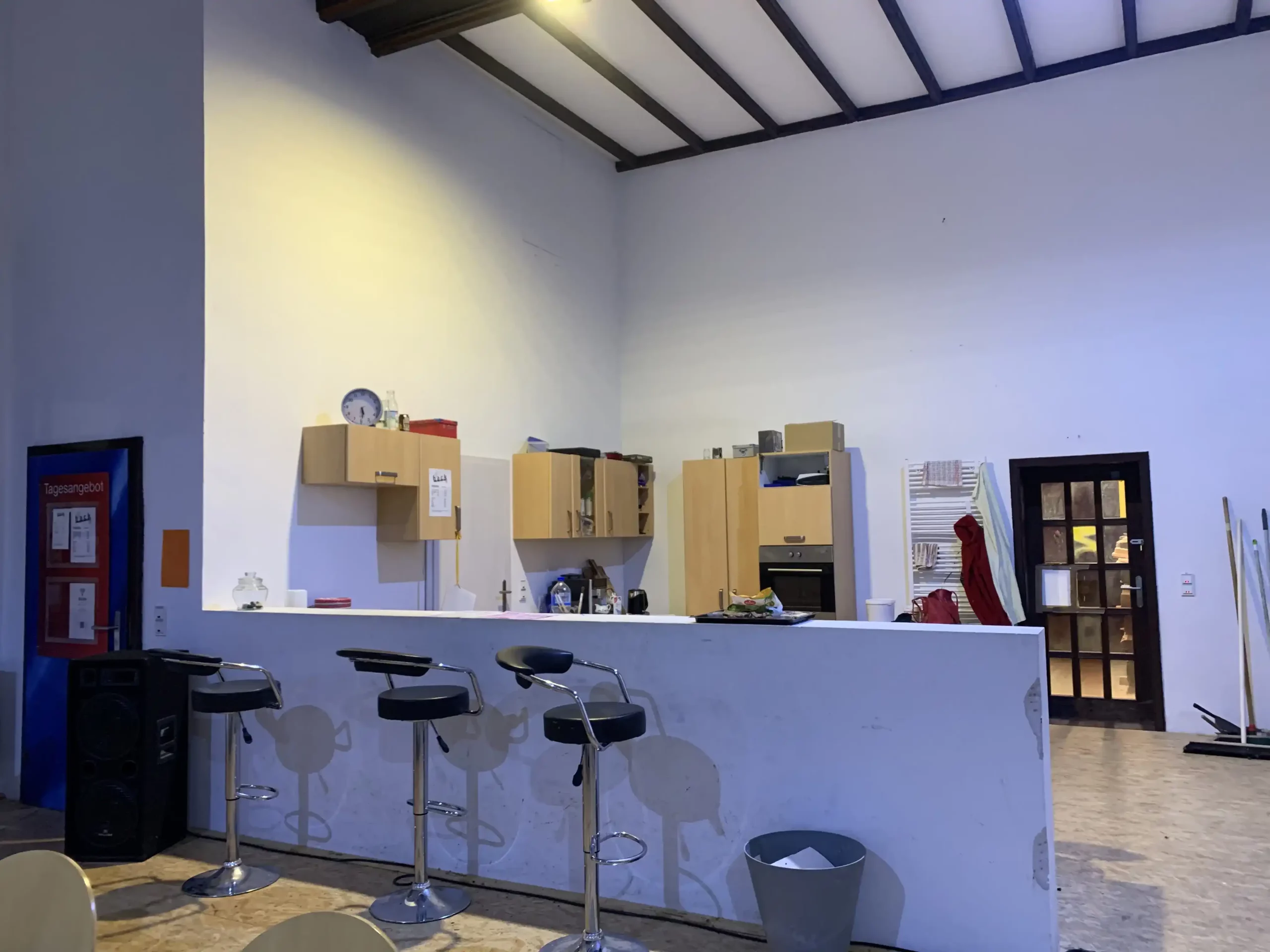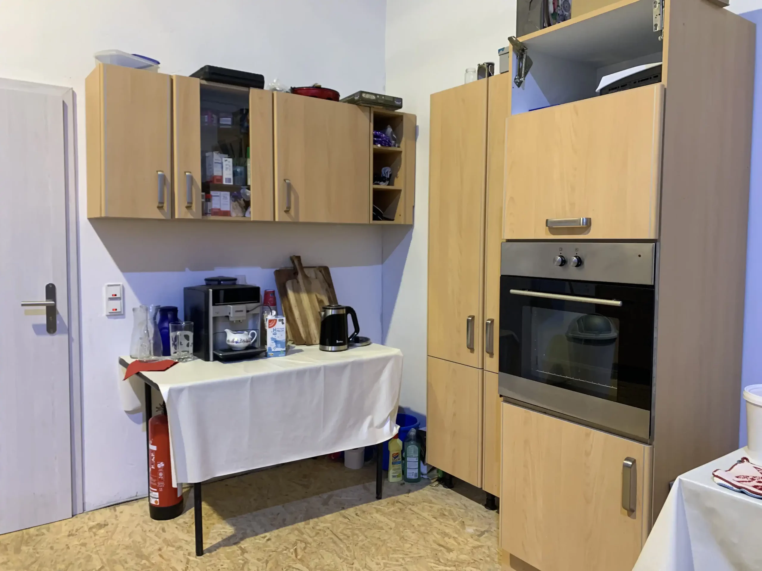 Es gibt rund 50 stapelbare Stühle, zwei Tischtennisplatten und einen Tischkicker. Eine gemauerte Barriere trennt den Küchenbereich mit E-Herd, Spüle, Spülmaschine, einem Getränkekühlschrank und einem Kaffeevollautomaten.